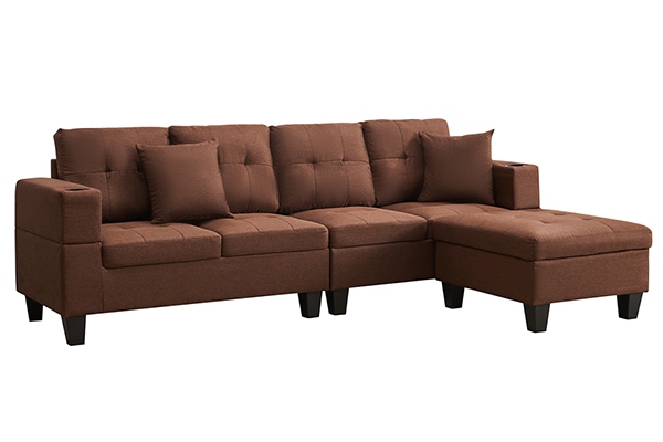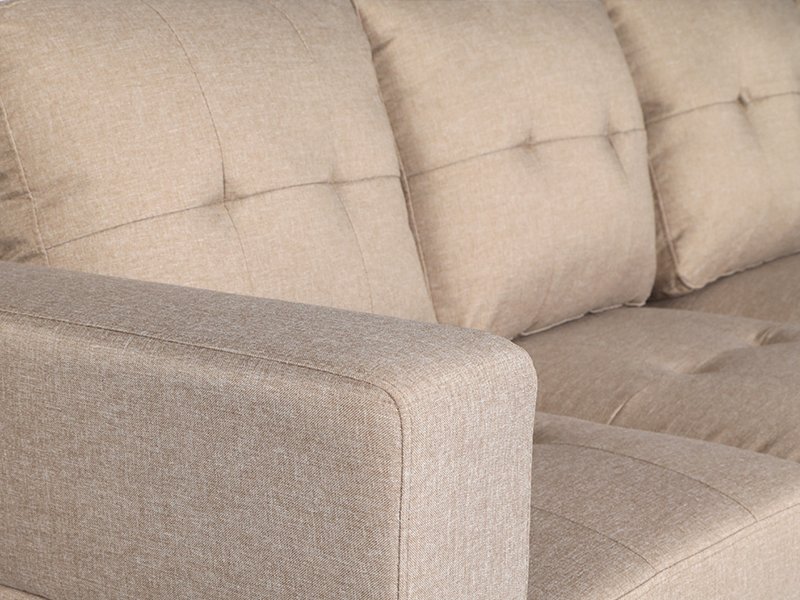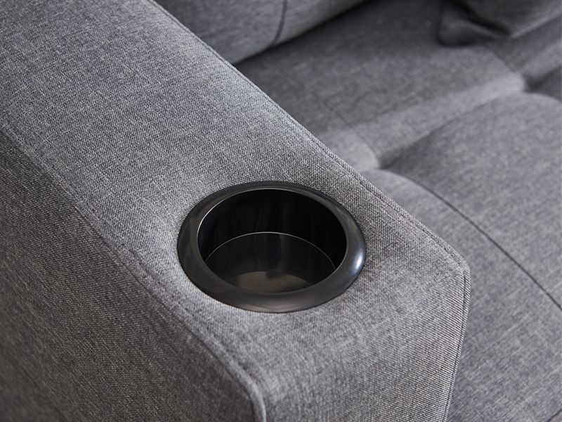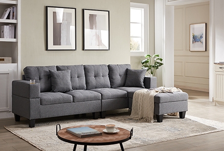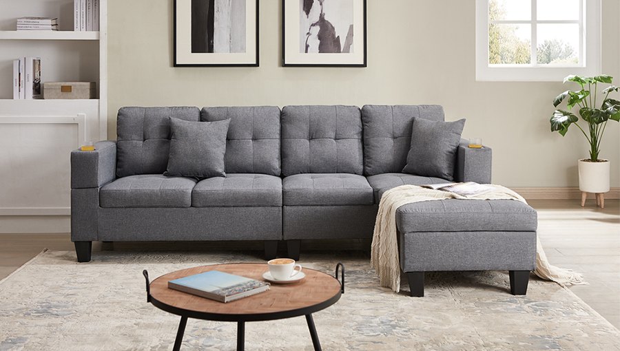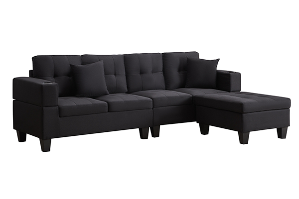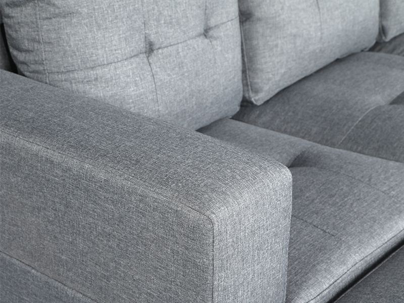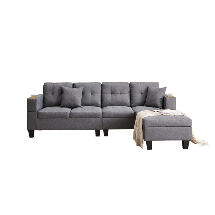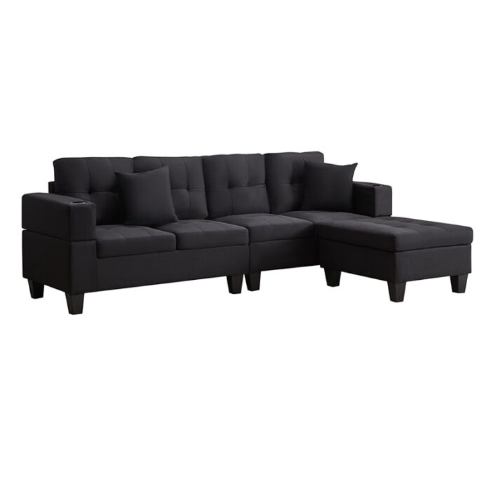 The Sectional Couch is available in black and grey linen fabric, both of which offer a sleek and modern look to your living room. The couch features a stylish tufted look, adding an extra touch of elegance to your home decor. Plus, the cupholders on both sides provide the perfect place to keep your favourite beverage close at hand while relaxing on your couch.
